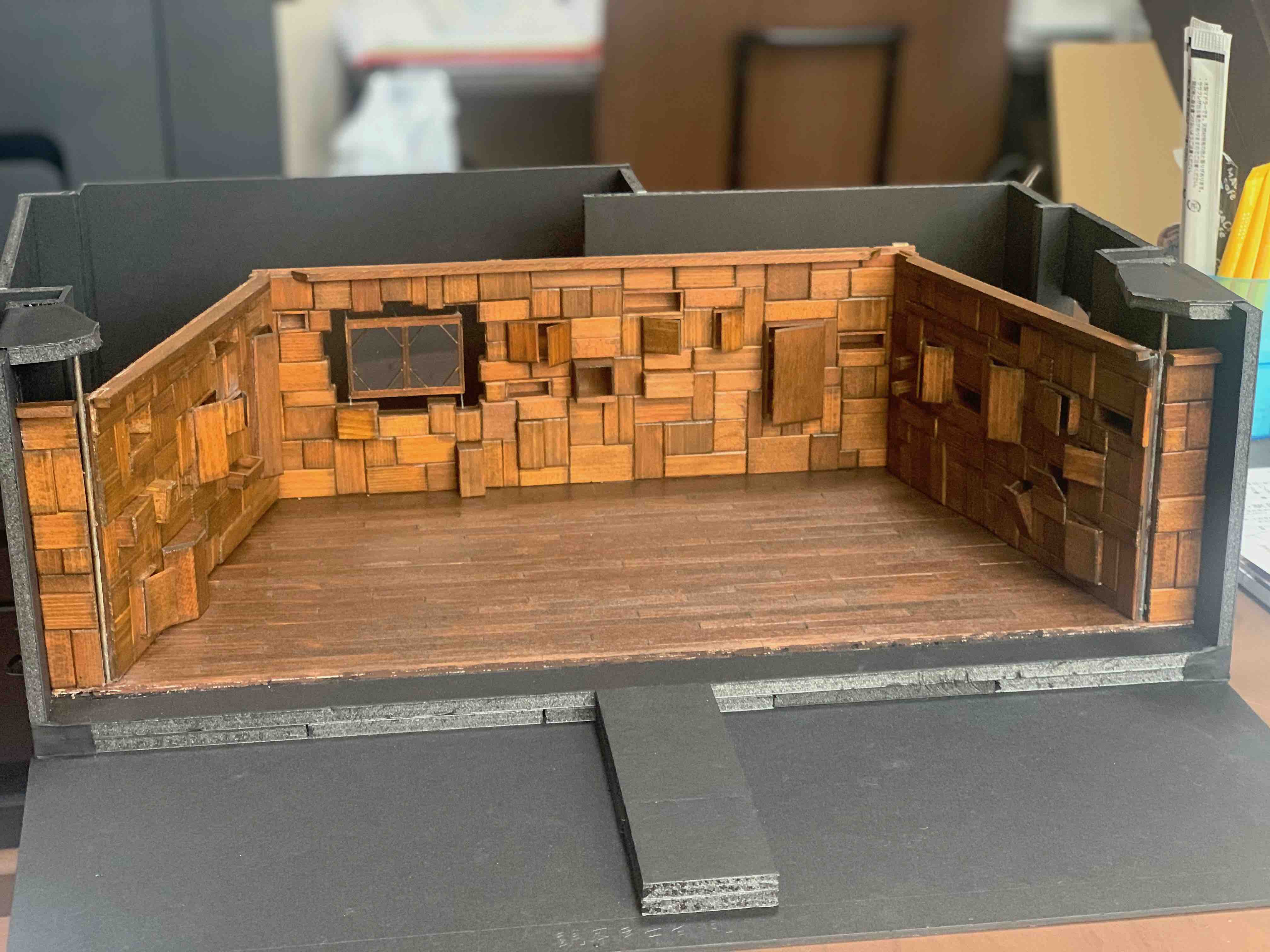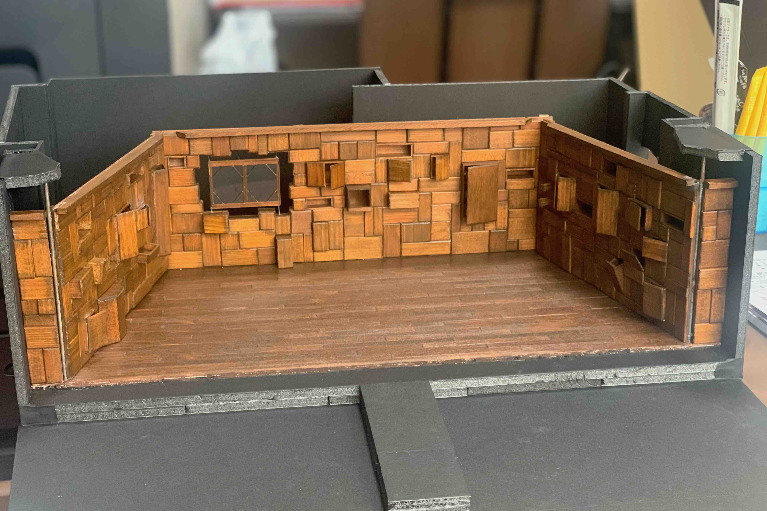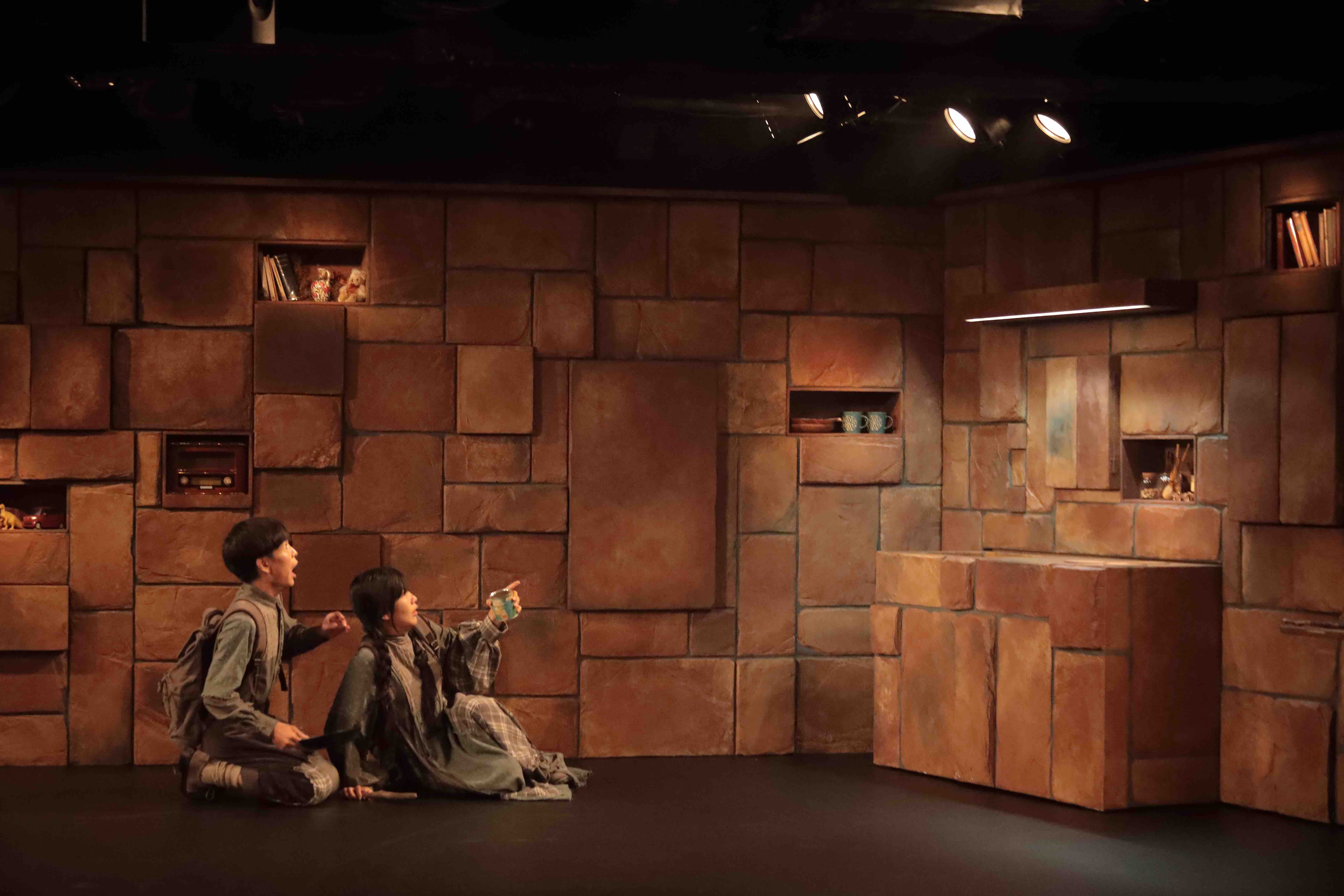 当初は木材で作る予定だったのだが、木材高騰により発泡スチロールを使用して発注。開演前は、観客席との間に〝壁〟が出来ており、開演すると真ん中で分かれ2つに開いていく。台形の形で止まり家となる。あらゆる箇所に扉や棚の仕掛けを設置。物語に登場するキッチン・冷蔵庫・電子レンジ・クローゼットなどが人物によって開けられ、または、自動的に開いたりする。下手奥に設置した窓は、宙に浮くように設置し、物語の中盤から雨が流れるという仕掛け。〝おかしな家〟という物語設定なので、宙に浮いた窓から雨が流れたり、壁だと思われた箇所が開いたり、その壁自体が動いたりするプラン。床面は、稽古場で木目調のポンリウムを使用していたのだが、壁の装飾をレンガ調にしたことから、木目調の床面との相性が悪く、劇場からは黒のリノリウムを使用。黒の床面にすることで、より壁が際立ち、人物たちも浮かび上がるようになった。