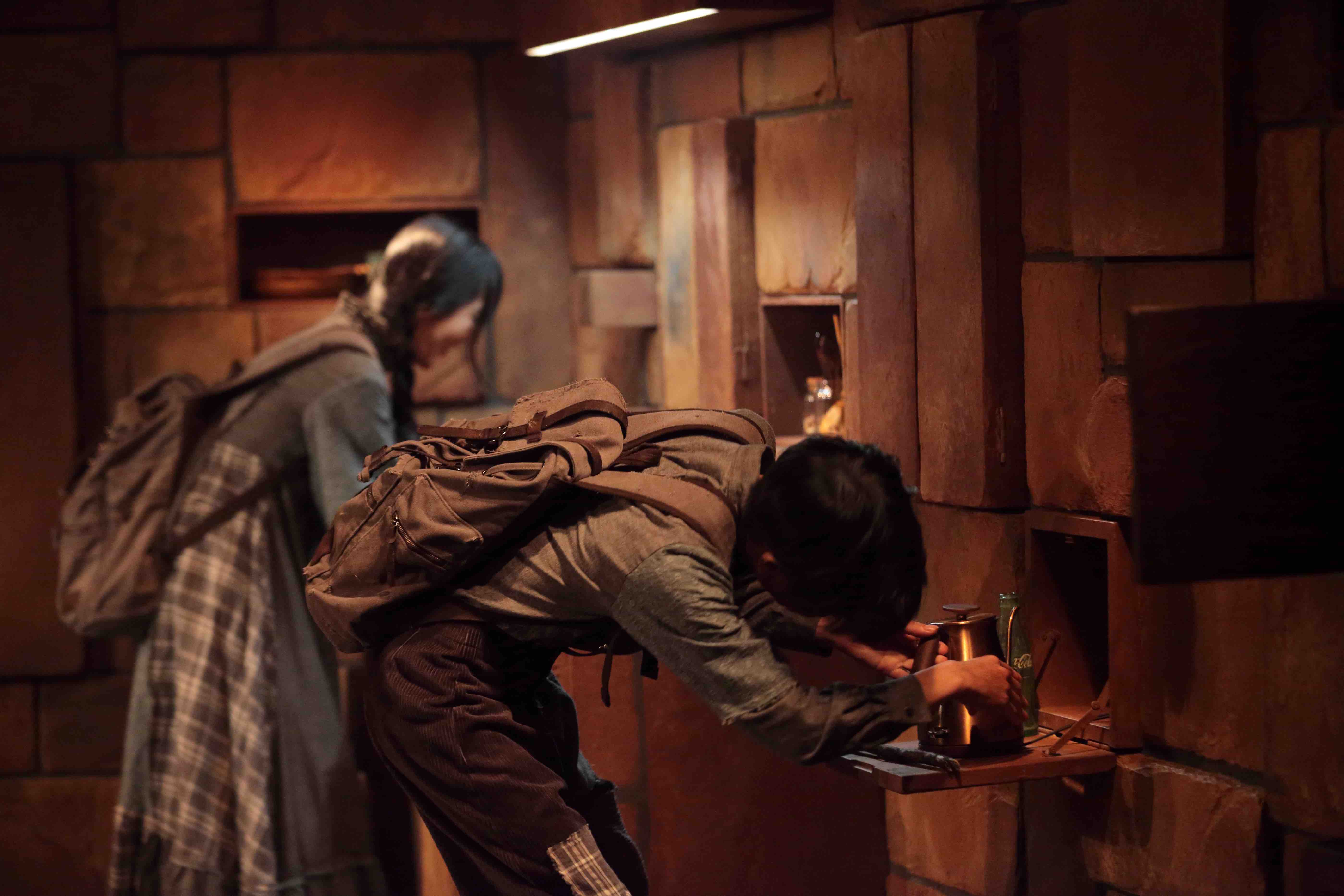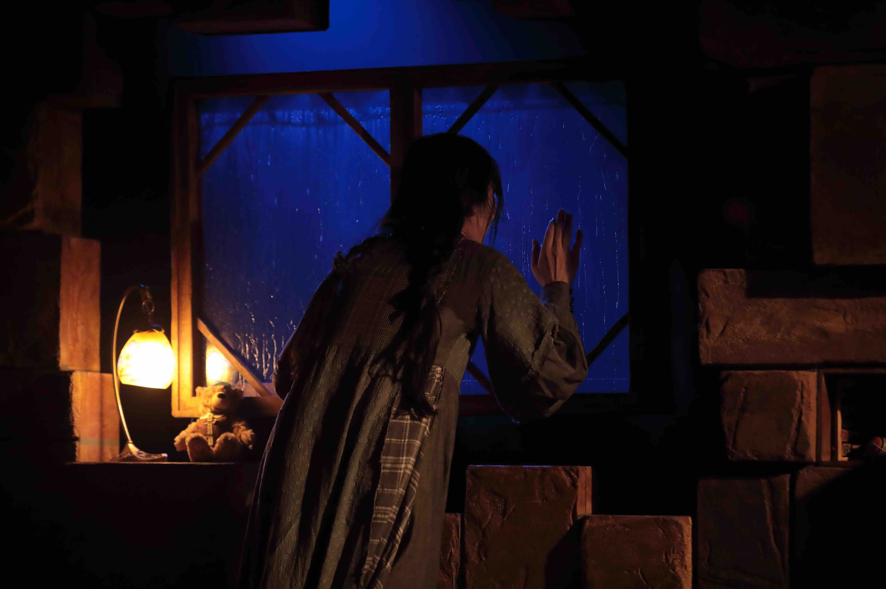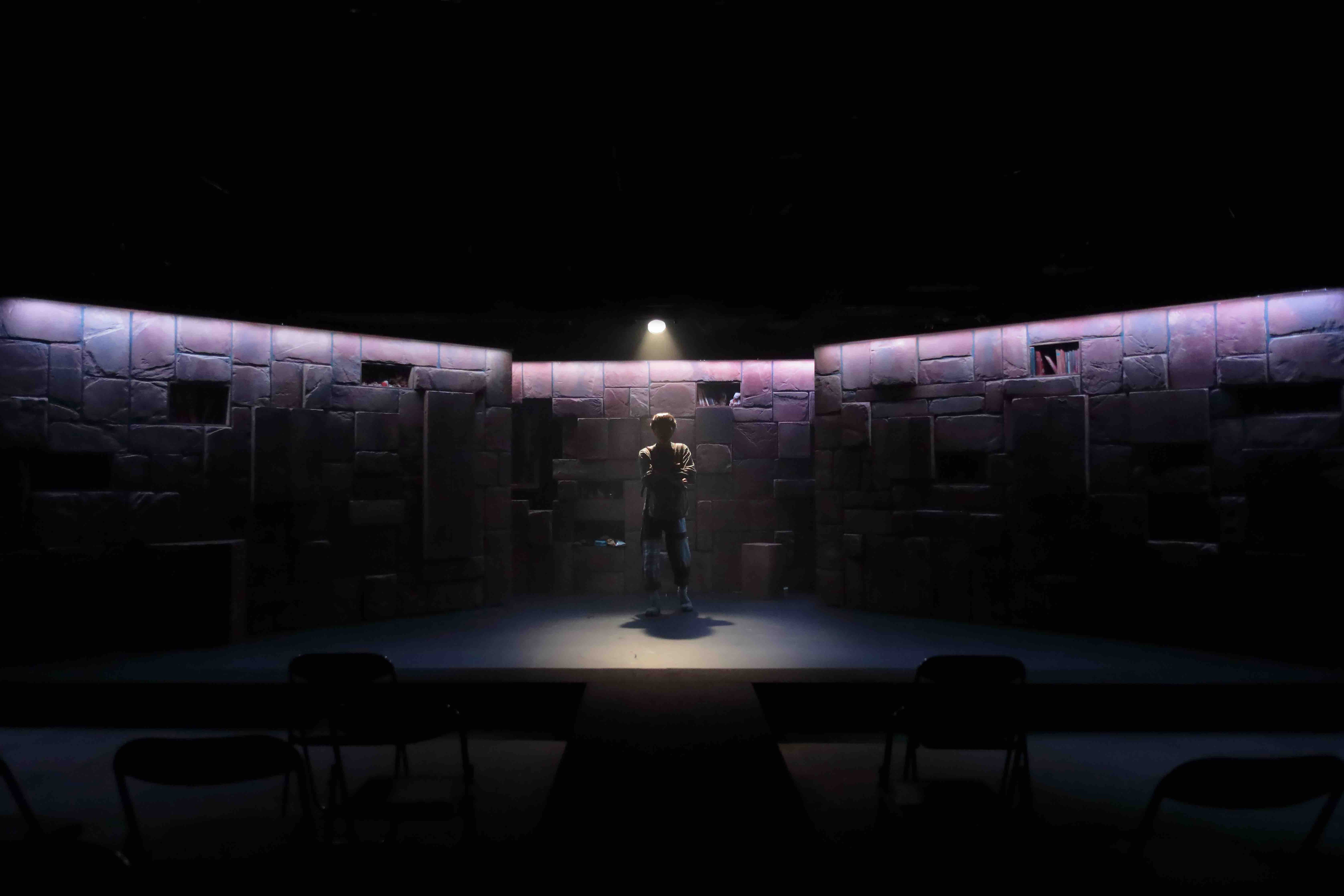 当初は木材で作る予定だったのだが、木材高騰により発泡スチロールを使用して発注。開演前は、観客席との間に〝壁〟が出来ており、開演すると真ん中で分かれ2つに開いていく。台形の形で止まり家となる。あらゆる箇所に扉や棚の仕掛けを設置。物語に登場するキッチン・冷蔵庫・電子レンジ・クローゼットなどが人物によって開けられ、または、自動的に開いたりする。下手奥に設置した窓は、宙に浮くように設置し、物語の中盤から雨が流れるという仕掛け。〝おかしな家〟という物語設定なので、宙に浮いた窓から雨が流れたり、壁だと思われた箇所が開いたり、その壁自体が動いたりするプラン。床面は、稽古場で木目調のポンリウムを使用していたのだが、壁の装飾をレンガ調にしたことから、木目調の床面との相性が悪く、劇場からは黒のリノリウムを使用。黒の床面にすることで、より壁が際立ち、人物たちも浮かび上がるようになった。