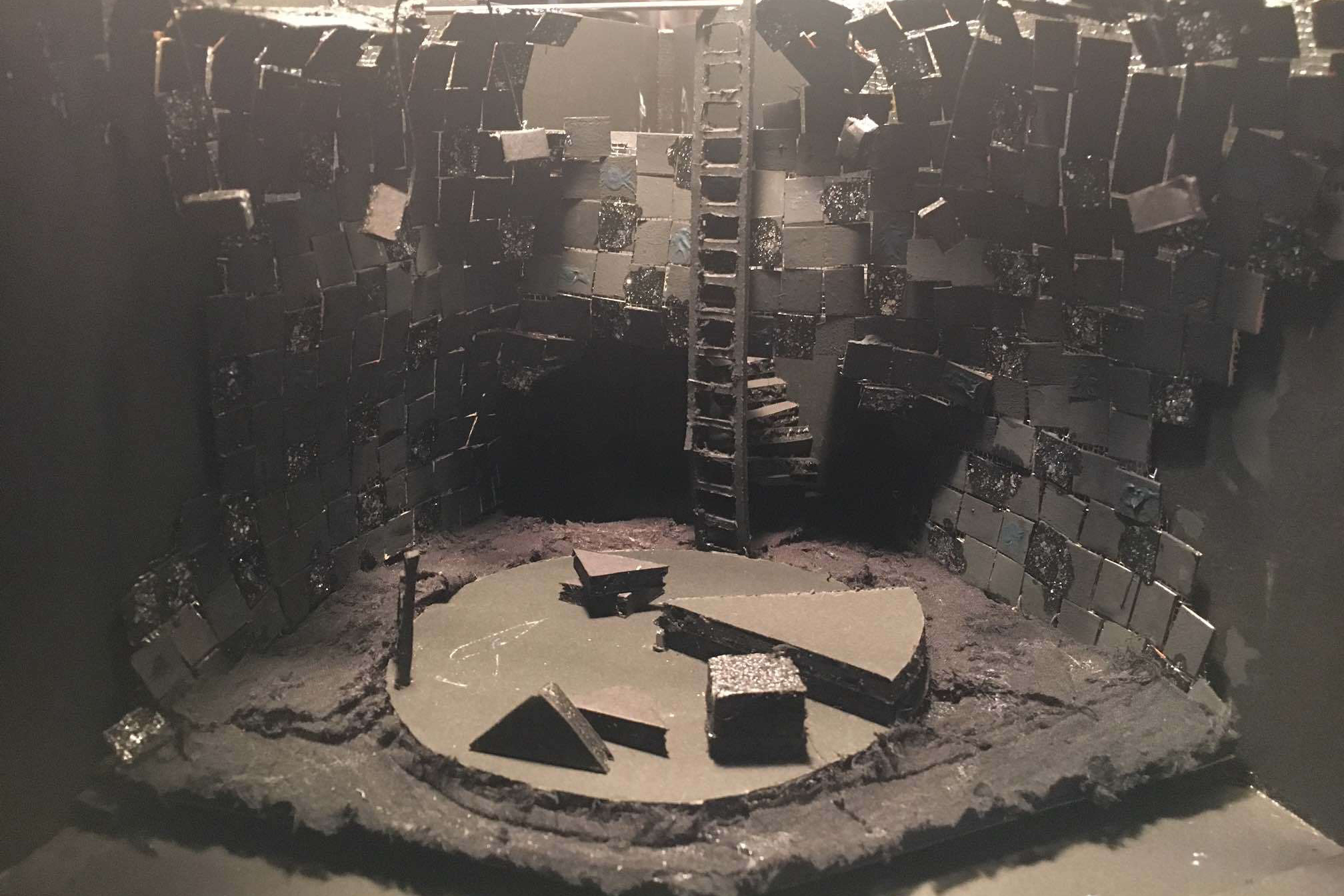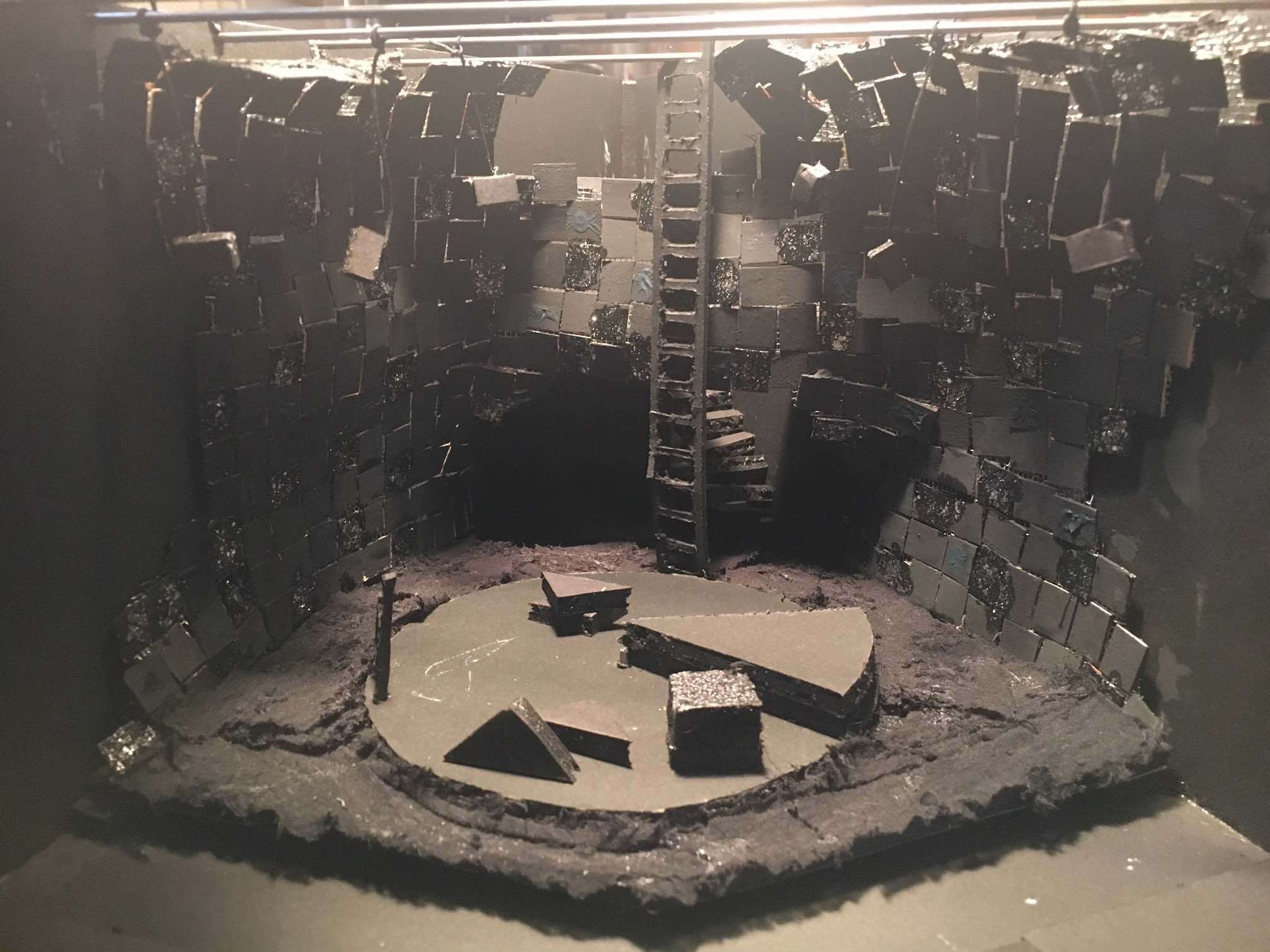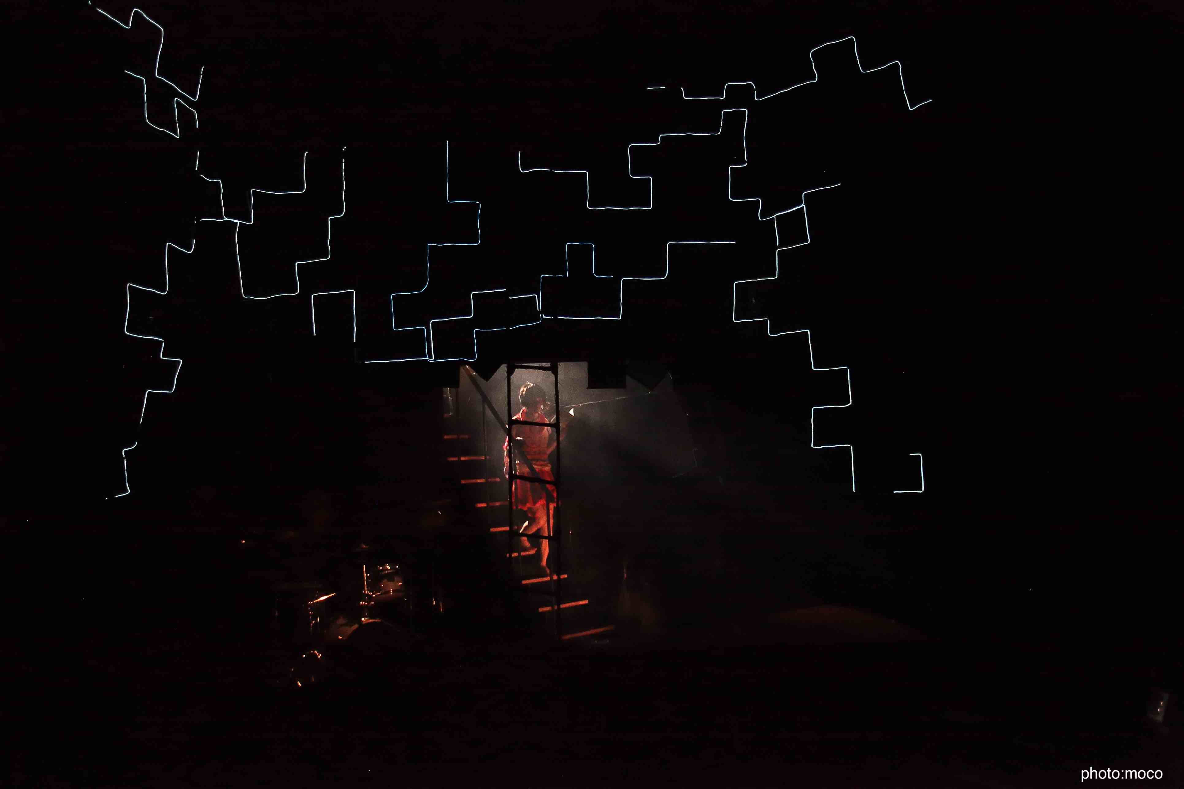 人魚が現代の都会にやってくるという物語なので、人魚視点の都会を描きたかった。ファンタジーとして描かれる人魚姫も、もし東京にやって来たら、この現代の光景もファンタジーに見えるだろうなと思ったのが美術を考えるきっかけ。美術に照明を組み込む仕掛けを多く考える。クリスマスで使われるイルミネーションライトを天井に仕込むことで、地上に憧れる人魚の心情が見えてくる。これは簡単な発想ではあったけど、素直に綺麗だった。都会にやってきた時には、壁の枠組みに沿って仕込んだ有機ELの細いライトがランダムに光り、都会の慌ただしさがでればいいなというアイデア。水族館のシーンでは、黒い壁(様々な素材の黒い布で作成)の中に、緑と青を合わせた照明ゼラ&魚の形に切り取った黒画用紙を仕込み、中に設置した明かりが点くことで、魚達が浮かび上がるという仕掛け。幻想的かつ、故郷の深海を想像させる切ないシーンにもなった。また、舞台には円形の回る土台を設置。これを作る技術はないので、円形土台だけは発注にする。この回す装置をやったことで「夢ぞろぞろ」のアイデアにも繋がったわけだが、この時の回す効果が、物語的な意味とリンクしきれなかったのが反省点。やりたい仕掛けが多すぎて予算をはるかにオーバー。しかし、視覚的に楽しいアイデアに満ちていた公演。