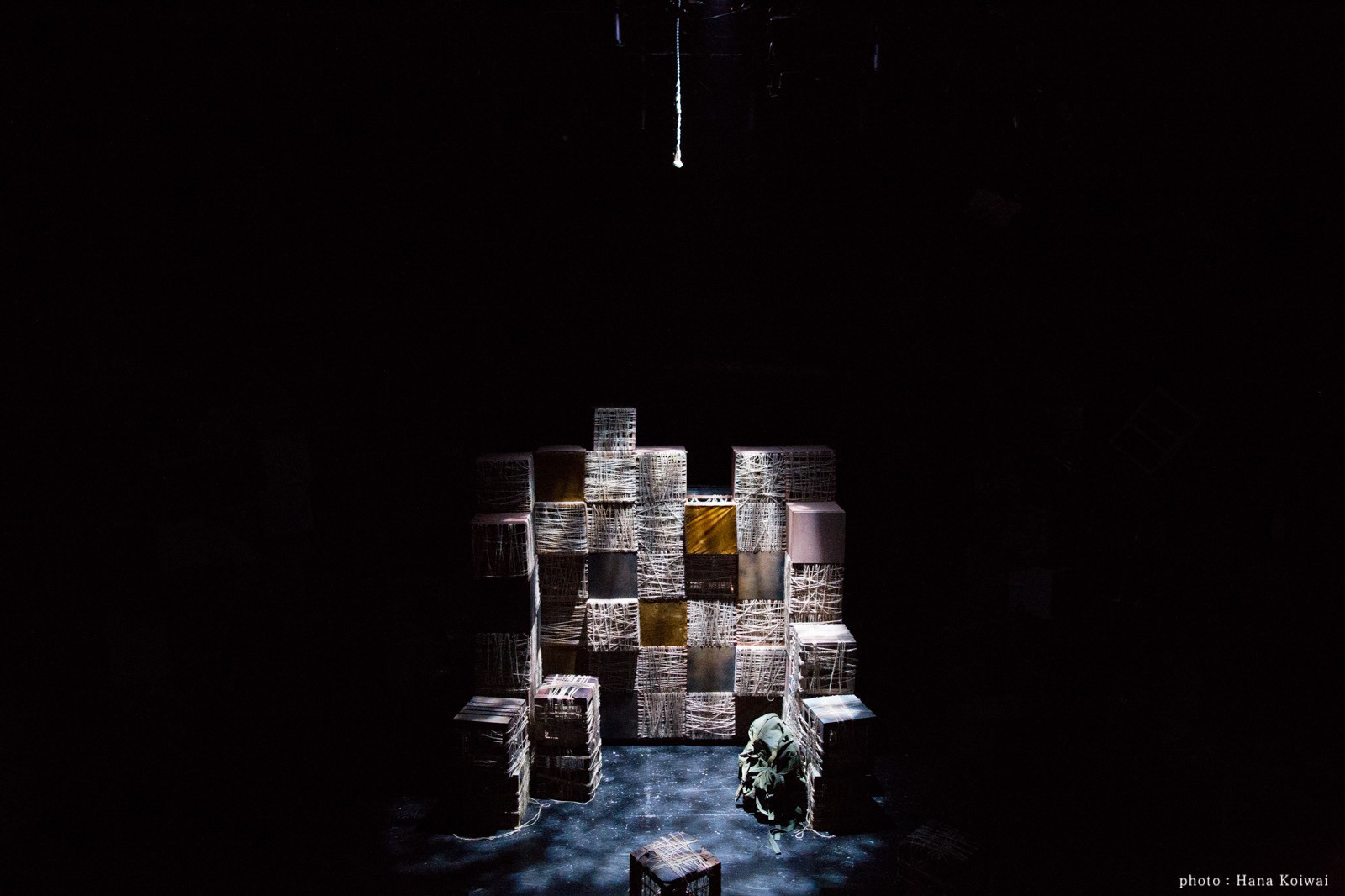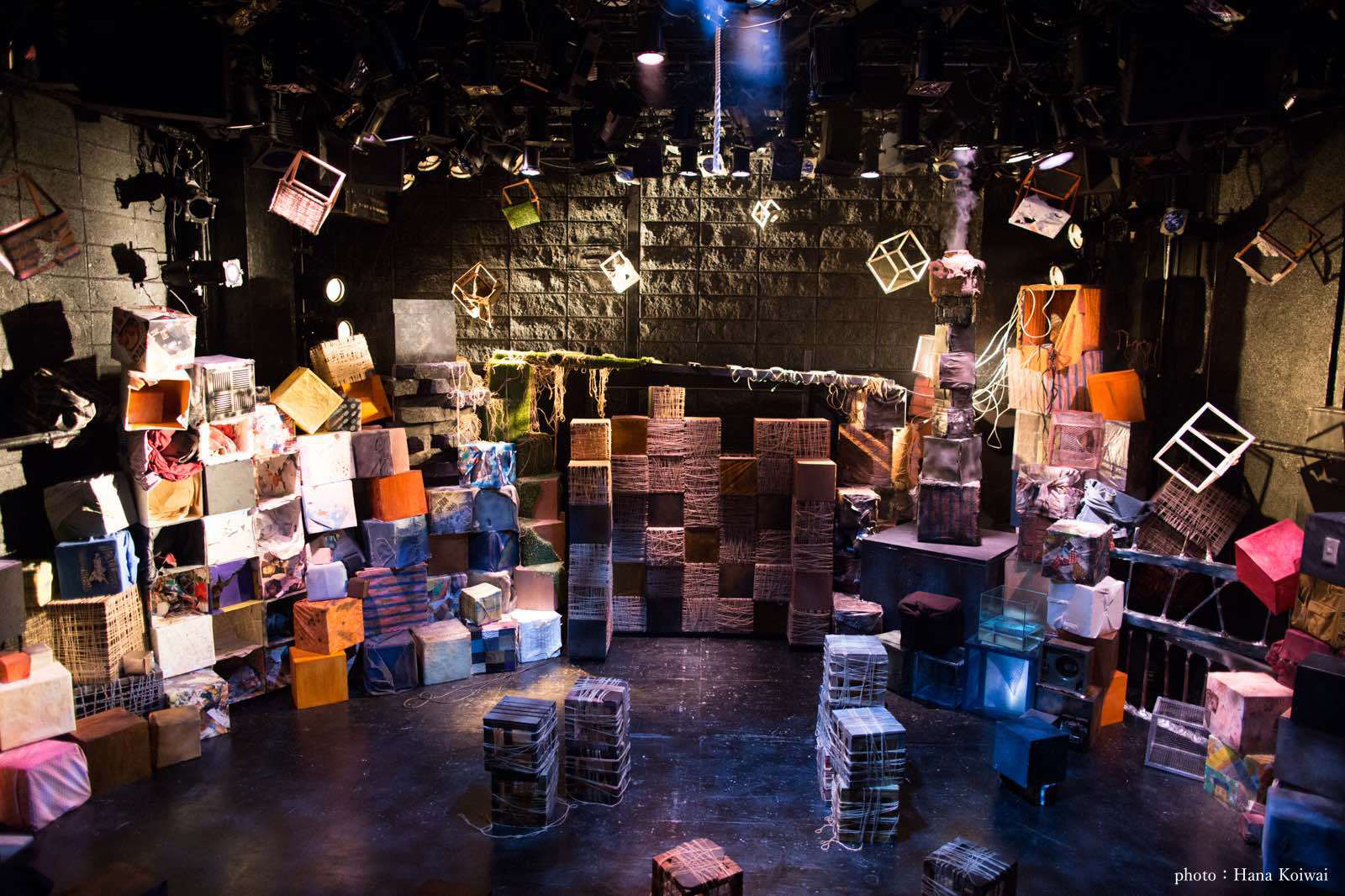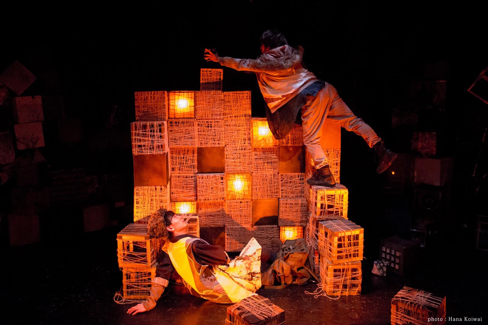 俳優・一色洋平と一緒に企画をし、美術・演出も2人で行った公演。近未来の一度滅んだ地球から、あらゆる物が発掘されていくという設定。雪山の洞穴に落ちてしまった2人が、そこで発掘・発見をしていく。地球上にある様々な素材を使って、色々な形の箱を積み重ねた美術にしたいねと作り始める。ブロードウェイで上演している「マチルダ」に大きな影響を受けている。積み重なった箱には、突如開いたり、煙が出たり、木が生えてきたりする仕掛けを。予算が無かったので、演者が登ったりしない箇所はダンボールを土台に装飾をしたり、発砲スチロールを使用。ある箱にはクッキングシートを塗料で茶色くし、それを貼った箱の中から光をあてることで、暖色系の明かりになり、物語の世界観が増したように思える。照明ゼラでもいいが、手作り感があって、それが温かみに繋がって良かったのかもしれない。積み重なった箱達から飛び散るように、宙にいくつかの箱を浮かせたのも、観客席側に物語が飛んでくるようで素敵だった。舞台だけではなく、お客さんが通る入り口からの通路にも照明を仕込んだりと、劇世界が開演前から始まっているのも、2人がこだわった好きな演出。そういう演劇が増えればいいなという想いも膨らむ。