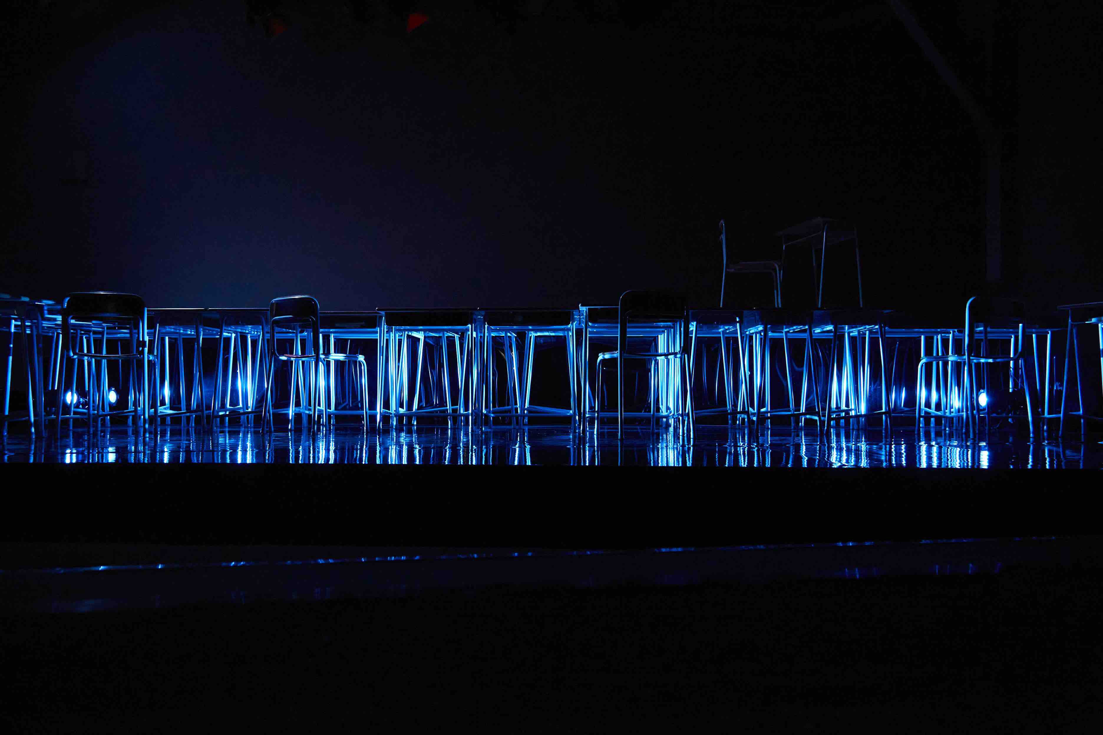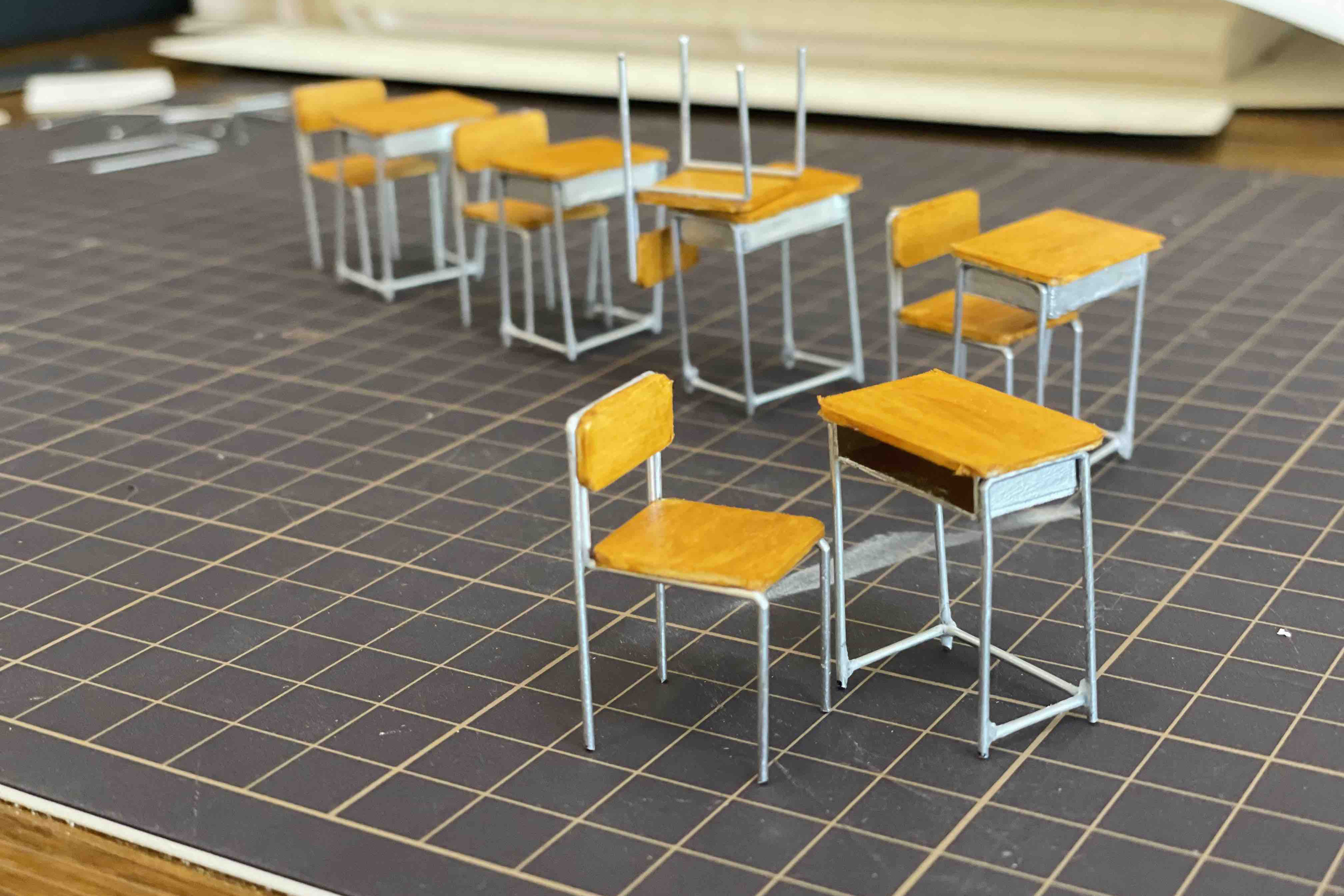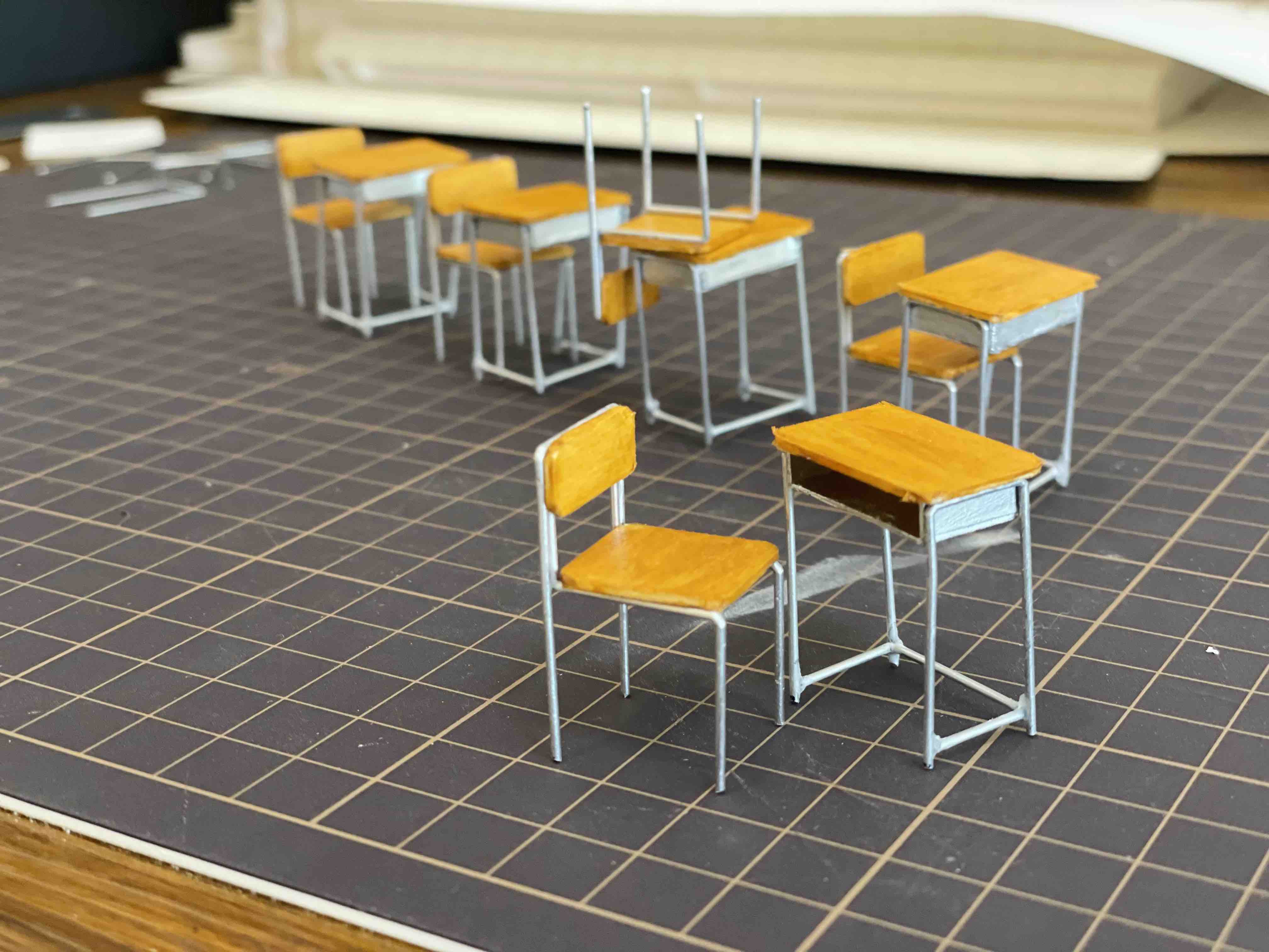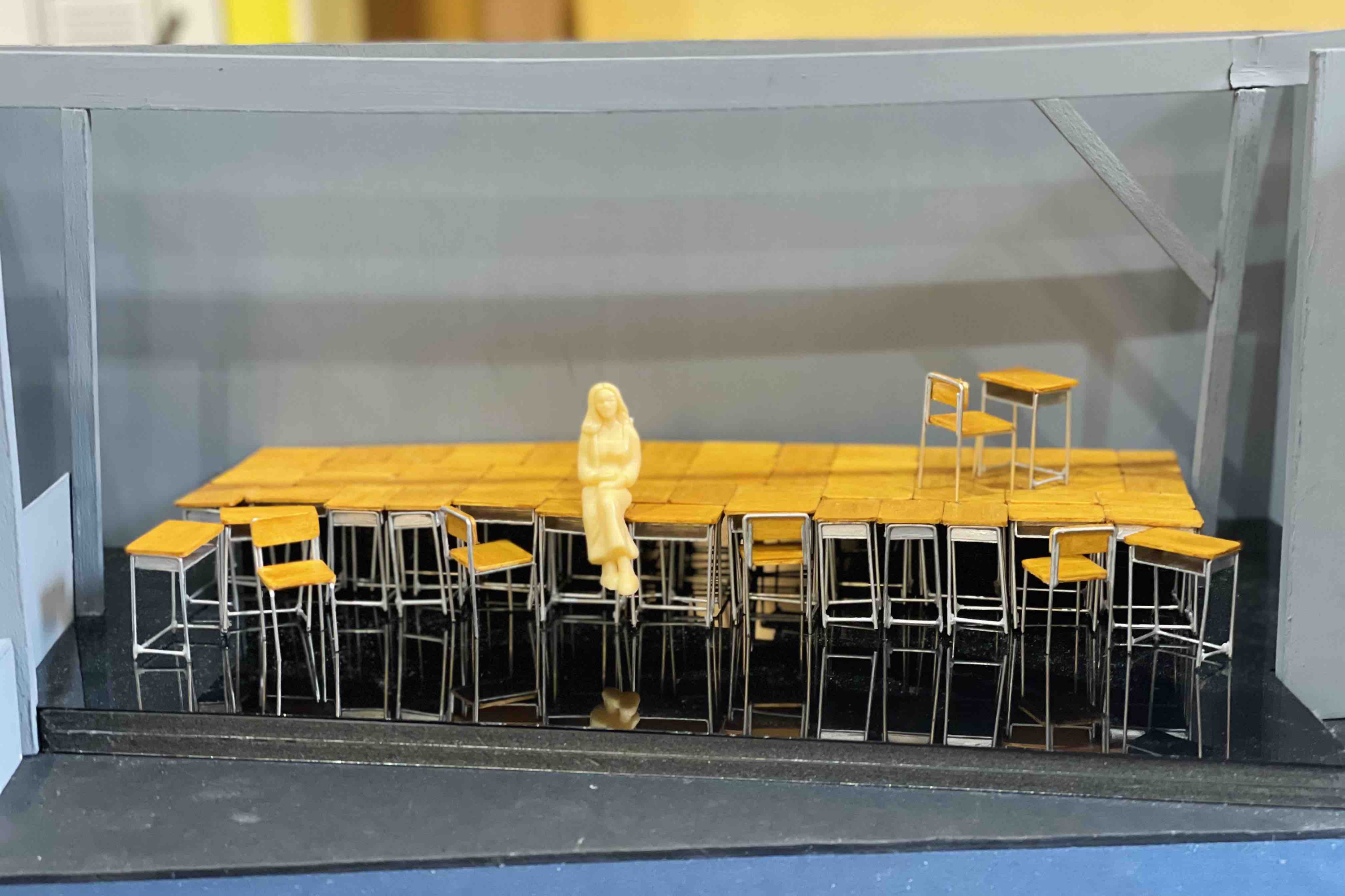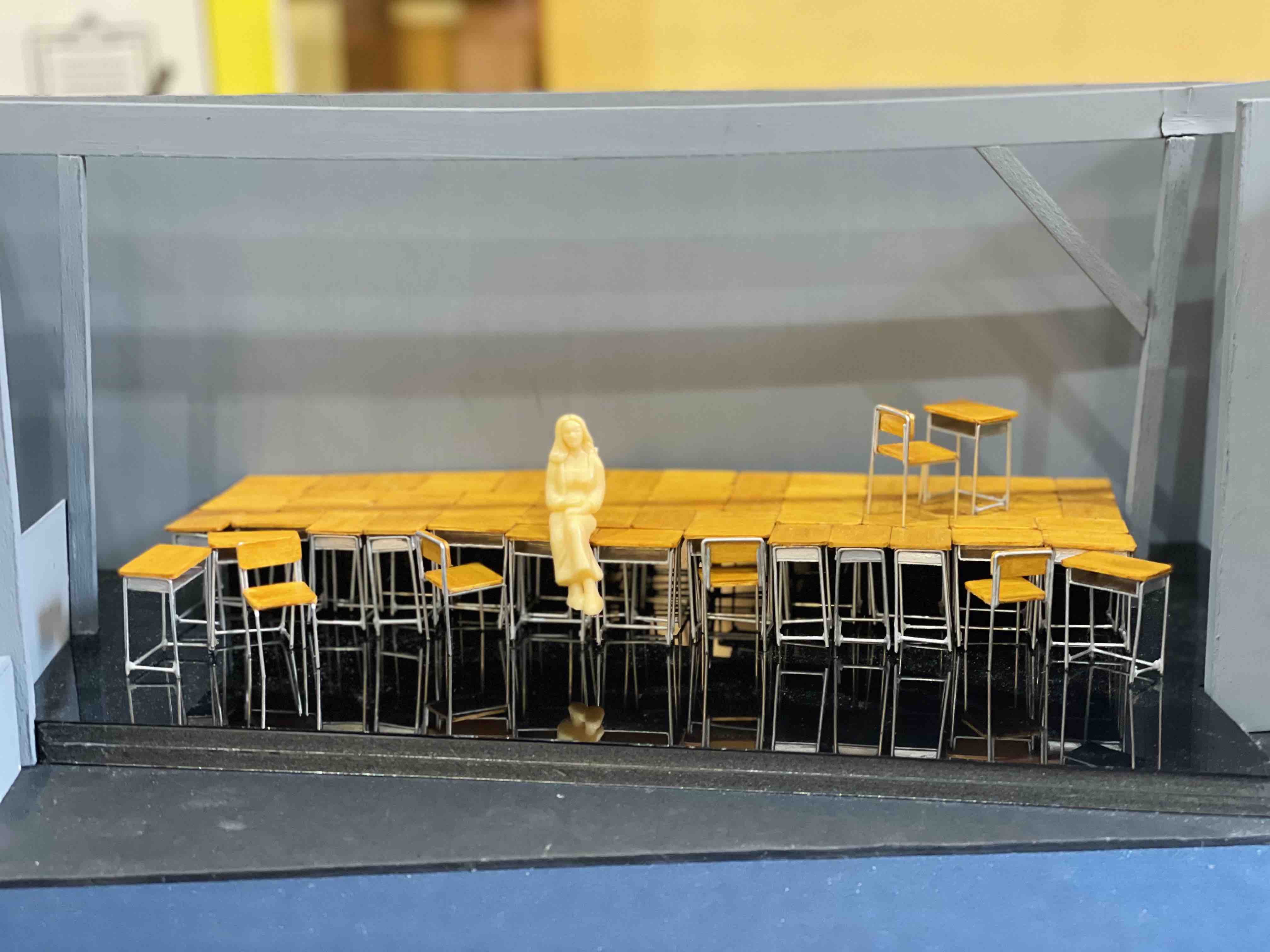 物語の設定は〝学校のプール〟だったので、高校演劇で上演された初演と同じく具象的なプールを作ろうとも考えた。けれど、具象のプールを舞台美術にしようとするとお金がかかりすぎるので、違うプランを考え始める。と同時に、舞台監督から「本当にプールが必要か」という意見アイデアをもらい、この物語に具象的なプールは必要ないのかもしれないと思い始める。物語上どうしても必要だと感じたのが〝高低差〟。登場人物である高校生たちが普段も使用している学校机を土台にすれば面白いかもと模型を作り始める。広い面の土台は安全面を考え全て固定。数個だけは動かせる状態にし、人物たちが好きな場所に置き、その行動によってその場所がプールにもなるという演出。だったのだが、やはり固定をしないと危ないので、動かさないプランに変更。床面はビニールマットの裏側を使用(片面はマットになっていて、もう片面は光沢になっている。多くの舞台で使用されるのはマット側)。机土台の半分から後ろは実は本物の机ではなく、天板だけを貼り付けたダミー土台。そうすることで安全かつ予算もおさえられる。しかし、この美術は脚がとても印象的だったので、ダミー土台には脚がないから、ダミー土台の側面(見える側)に、「鶴かもしれない2020」でも使用した塩ビ板の黒光沢を貼り付ける。そうすることで前側の本物机の脚が映り込み、ダミーにも脚があるように少しは見える。照明も反射し、とても綺麗だった。