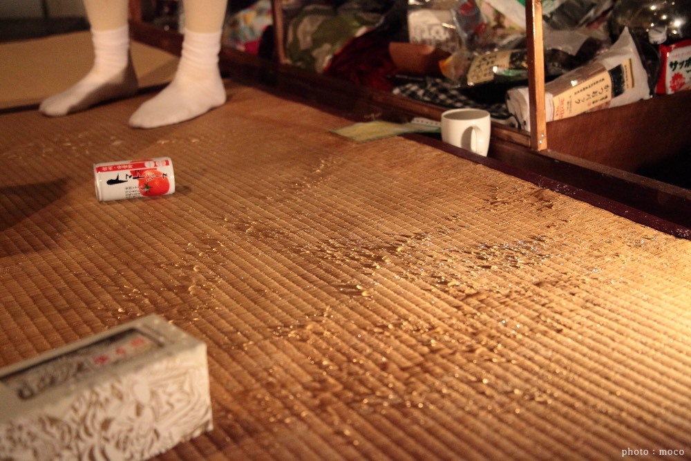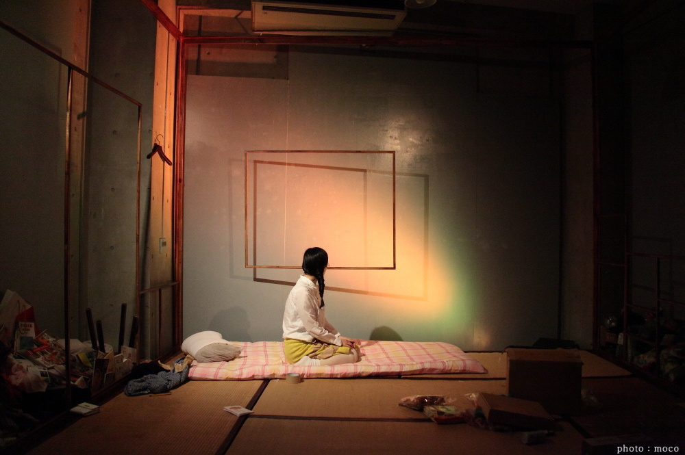 演者を変えての2バージョンあったので、一方は、現実の物を小道具として散りばめ、もう一方は、全てダンボール素材で上演。同じ台本でも演出方法を変えるだけで、こんなにも印象が変わるのかと発見が多かった。特に、ダンボールで上演している方は、集中力や笑い声も増えていたのが興味深かった。おそらく、演者がその場で紙を破いて服にしたり、ダンボール素材の筒をコップにしたりと、これは何だろう?とお客さんが考え理解しながら物語が進んでいくから、物語とは別の楽しみ要素があったからじゃないかと考える。小さなスペースだったので、6畳の畳と部屋の枠組みだけだったが、この枠組みにブラックライト効果の仕掛けをしたのが面白かったこと。通常の明かりでは発色しないのに、ブラックライトには反応し、その部分だけが発色する。お値段も高い塗料なので、なかなか手をだせないが、このブラックライト効果にハマり「鶴かもしれない2016」の衣裳アイデアにも繋がる。水(油の設定)をまくシーンがあったので、畳の下にはブルーシートで対策。畳は、いらない畳ありませんか?と畳屋さんに片っ端から電話をし譲ってもらったもの。