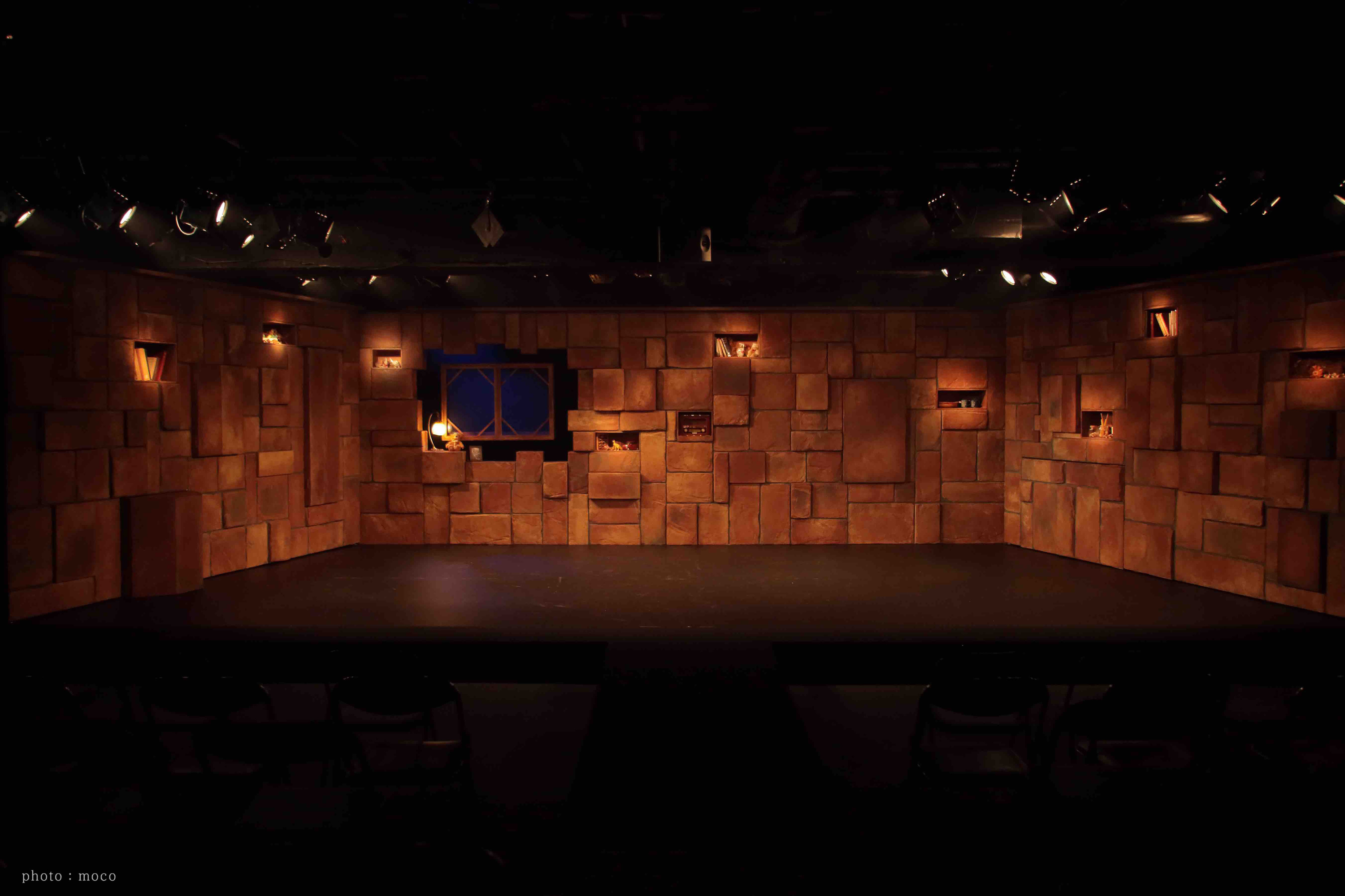 当初は木材で作る予定だったのだが、木材高騰により発泡スチロールを使用して発注。開演前は、観客席との間に〝壁〟が出来ており、開演すると真ん中で分かれ2つに開いていく。台形の形で止まり家となる。あらゆる箇所に扉や棚の仕掛けを設置。物語に登場するキッチン・冷蔵庫・電子レンジ・クローゼットなどが人物によって開けられ、または、自動的に開いたりする。下手奥に設置した窓は、宙に浮くように設置し、物語の中盤から雨が流れるという仕掛け。〝おかしな家〟という物語設定なので、宙に浮いた窓から雨が流れたり、壁だと思われた箇所が開いたり、その壁自体が動いたりするプラン。床面は、稽古場で木目調のポンリウムを使用していたのだが、壁の装飾をレンガ調にしたことから、木目調の床面との相性が悪く、劇場からは黒のリノリウムを使用。黒の床面にすることで、より壁が際立ち、人物たちも浮かび上がるようになった。