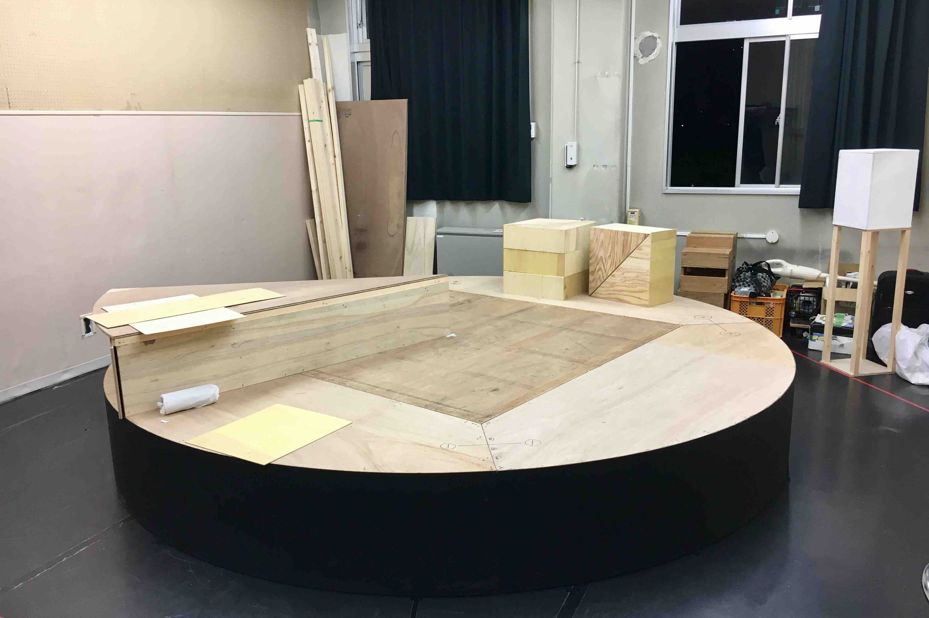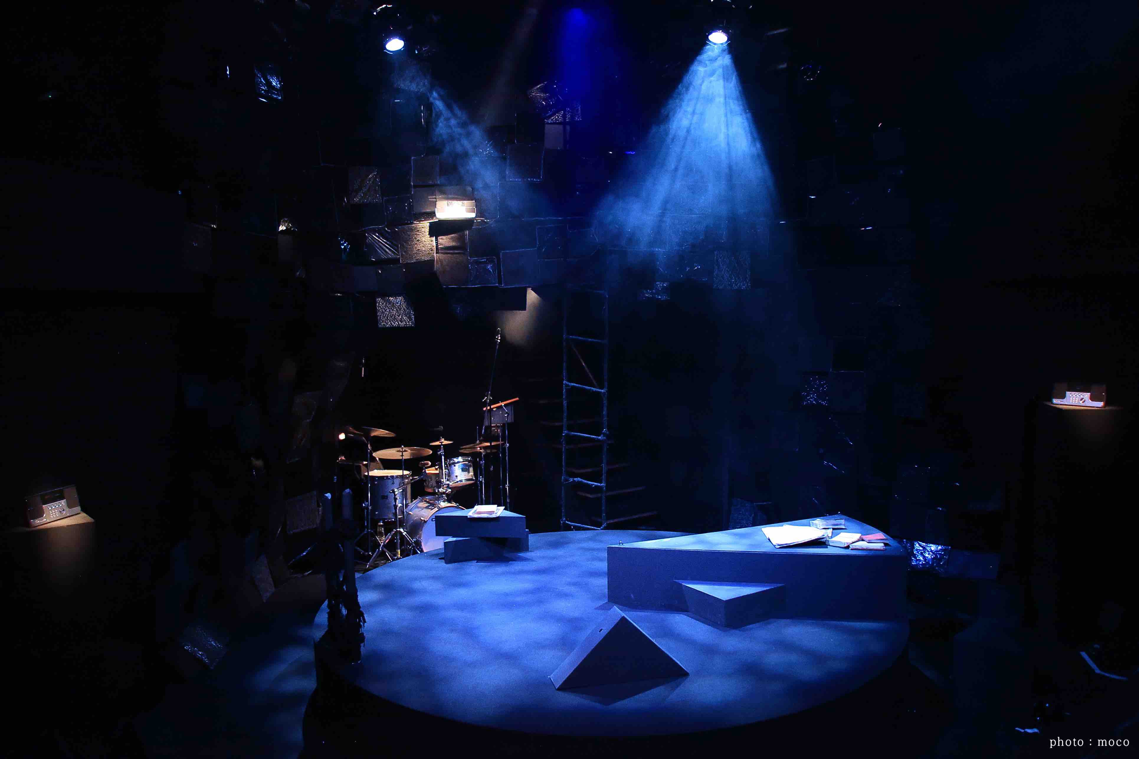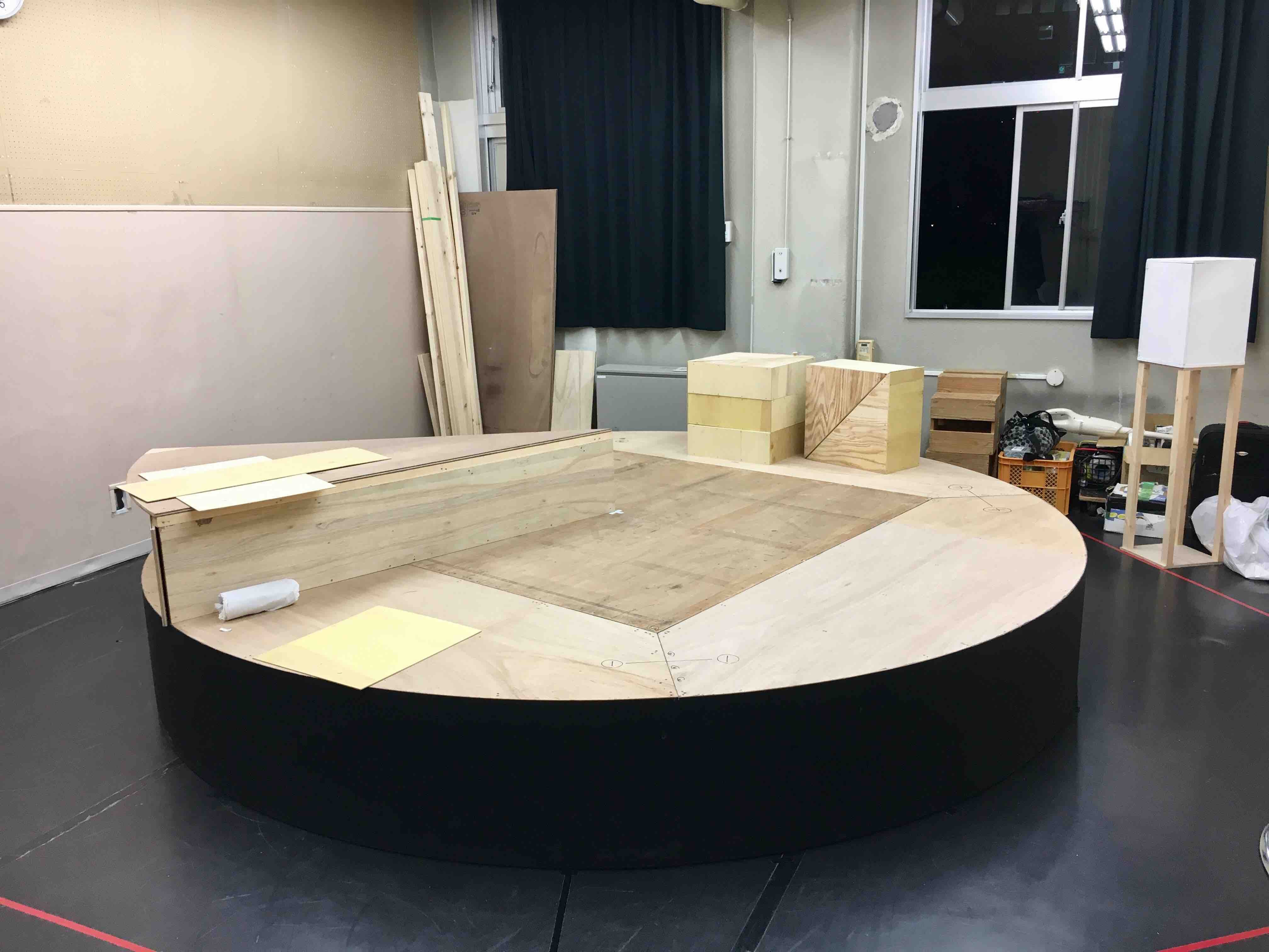 人魚が現代の都会にやってくるという物語なので、人魚視点の都会を描きたかった。ファンタジーとして描かれる人魚姫も、もし東京にやって来たら、この現代の光景もファンタジーに見えるだろうなと思ったのが美術を考えるきっかけ。美術に照明を組み込む仕掛けを多く考える。クリスマスで使われるイルミネーションライトを天井に仕込むことで、地上に憧れる人魚の心情が見えてくる。これは簡単な発想ではあったけど、素直に綺麗だった。都会にやってきた時には、壁の枠組みに沿って仕込んだ有機ELの細いライトがランダムに光り、都会の慌ただしさがでればいいなというアイデア。水族館のシーンでは、黒い壁(様々な素材の黒い布で作成)の中に、緑と青を合わせた照明ゼラ&魚の形に切り取った黒画用紙を仕込み、中に設置した明かりが点くことで、魚達が浮かび上がるという仕掛け。幻想的かつ、故郷の深海を想像させる切ないシーンにもなった。また、舞台には円形の回る土台を設置。これを作る技術はないので、円形土台だけは発注にする。この回す装置をやったことで「夢ぞろぞろ」のアイデアにも繋がったわけだが、この時の回す効果が、物語的な意味とリンクしきれなかったのが反省点。やりたい仕掛けが多すぎて予算をはるかにオーバー。しかし、視覚的に楽しいアイデアに満ちていた公演。