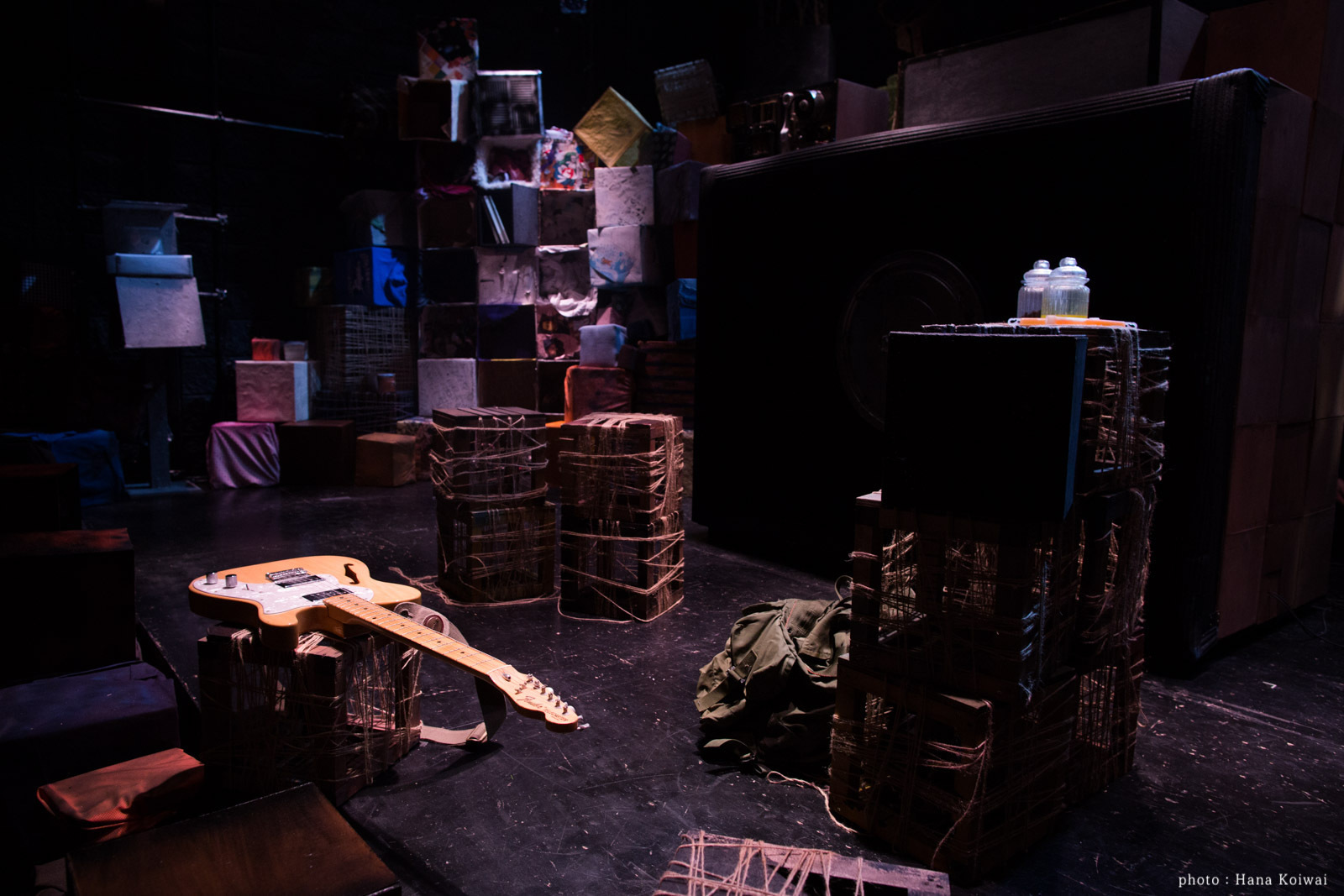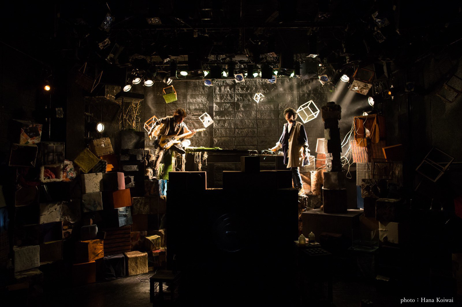 俳優・一色洋平と一緒に企画をし、美術・演出も2人で行った公演。近未来の一度滅んだ地球から、あらゆる物が発掘されていくという設定。雪山の洞穴に落ちてしまった2人が、そこで発掘・発見をしていく。地球上にある様々な素材を使って、色々な形の箱を積み重ねた美術にしたいねと作り始める。ブロードウェイで上演している「マチルダ」に大きな影響を受けている。積み重なった箱には、突如開いたり、煙が出たり、木が生えてきたりする仕掛けを。予算が無かったので、演者が登ったりしない箇所はダンボールを土台に装飾をしたり、発砲スチロールを使用。ある箱にはクッキングシートを塗料で茶色くし、それを貼った箱の中から光をあてることで、暖色系の明かりになり、物語の世界観が増したように思える。照明ゼラでもいいが、手作り感があって、それが温かみに繋がって良かったのかもしれない。積み重なった箱達から飛び散るように、宙にいくつかの箱を浮かせたのも、観客席側に物語が飛んでくるようで素敵だった。舞台だけではなく、お客さんが通る入り口からの通路にも照明を仕込んだりと、劇世界が開演前から始まっているのも、2人がこだわった好きな演出。そういう演劇が増えればいいなという想いも膨らむ。