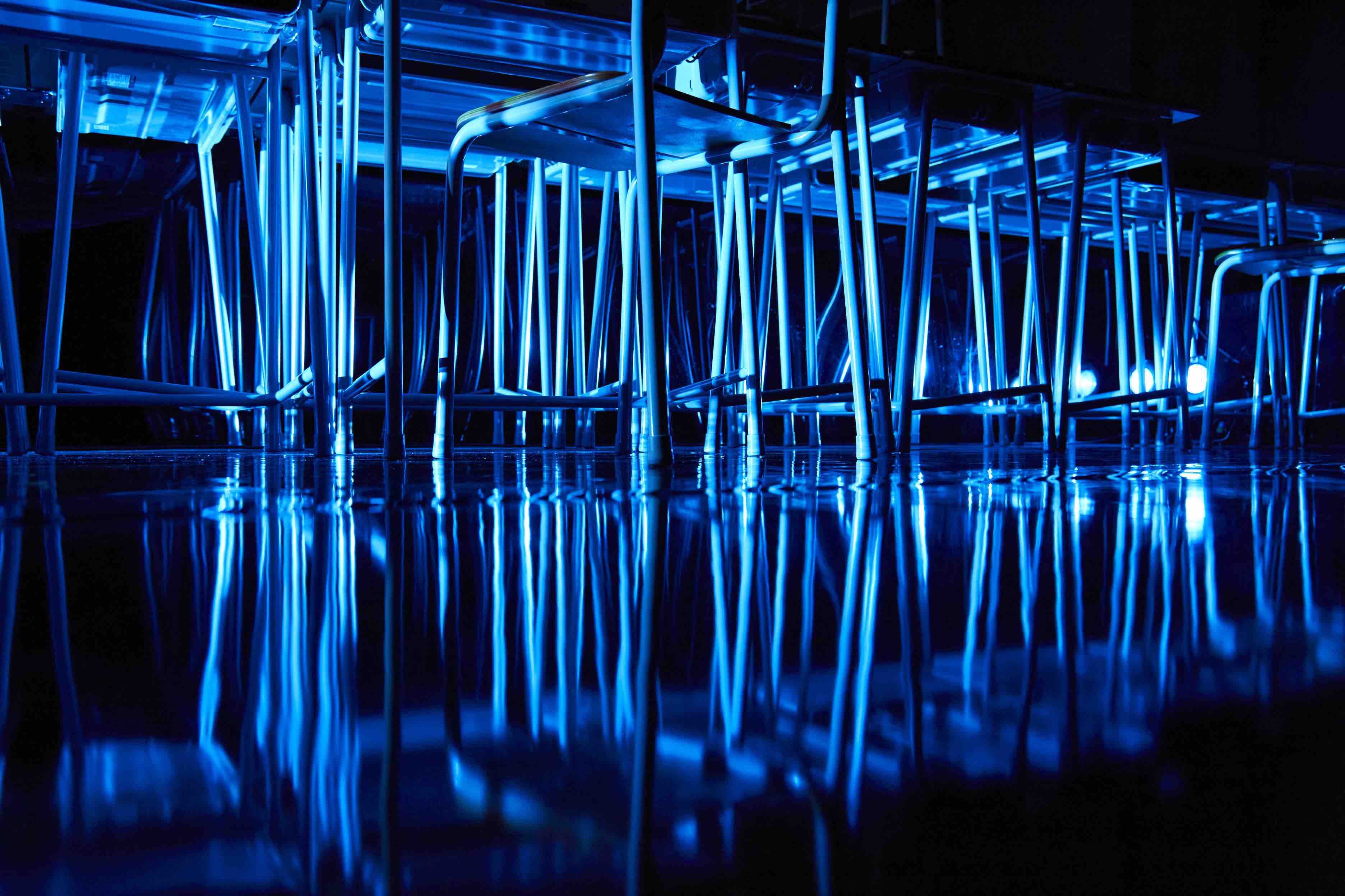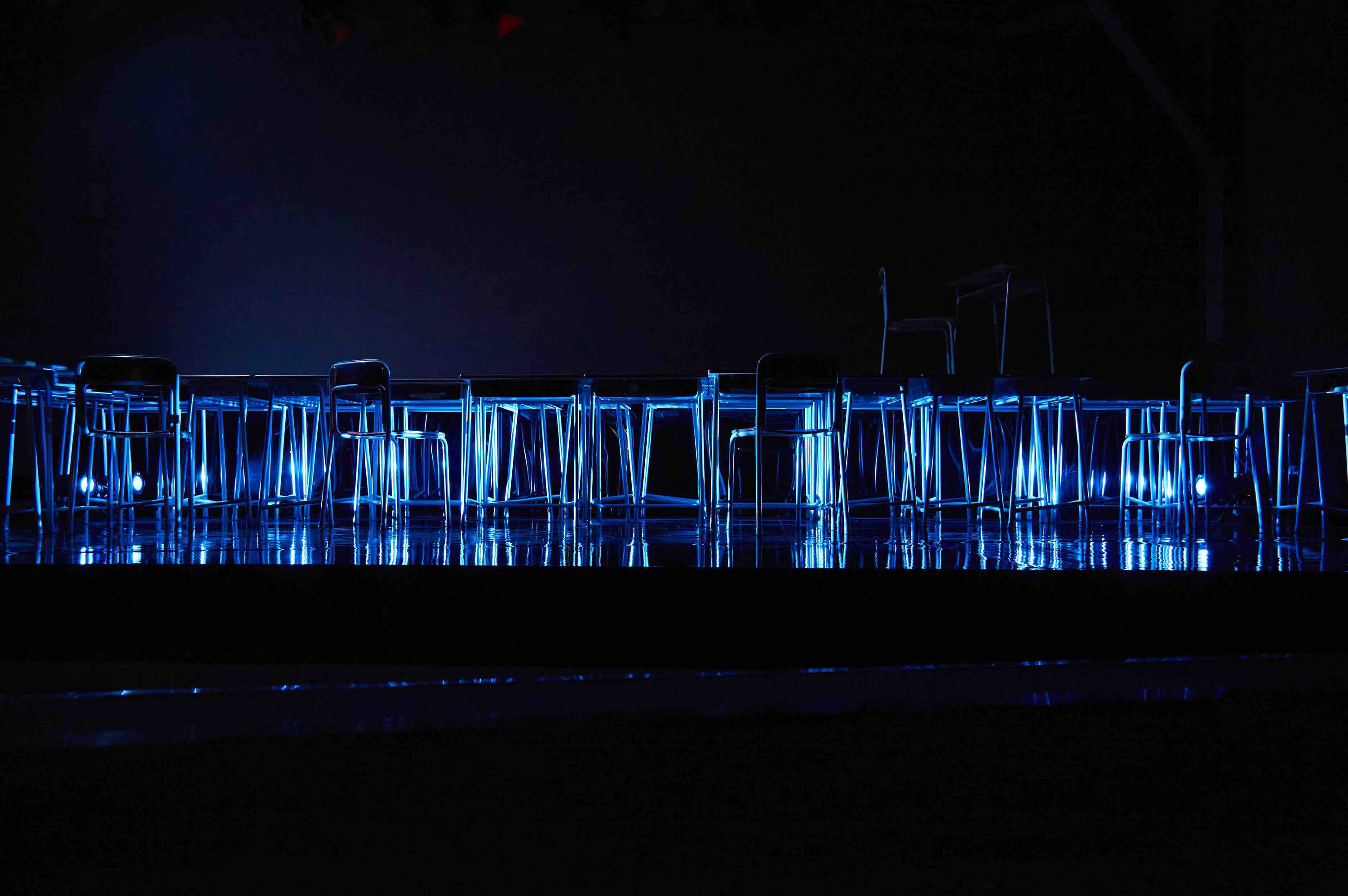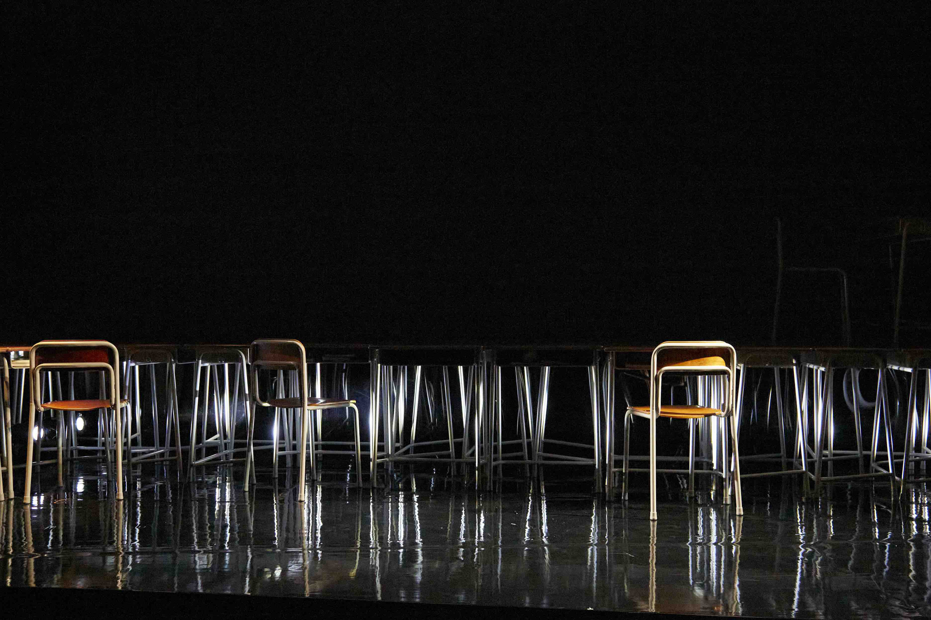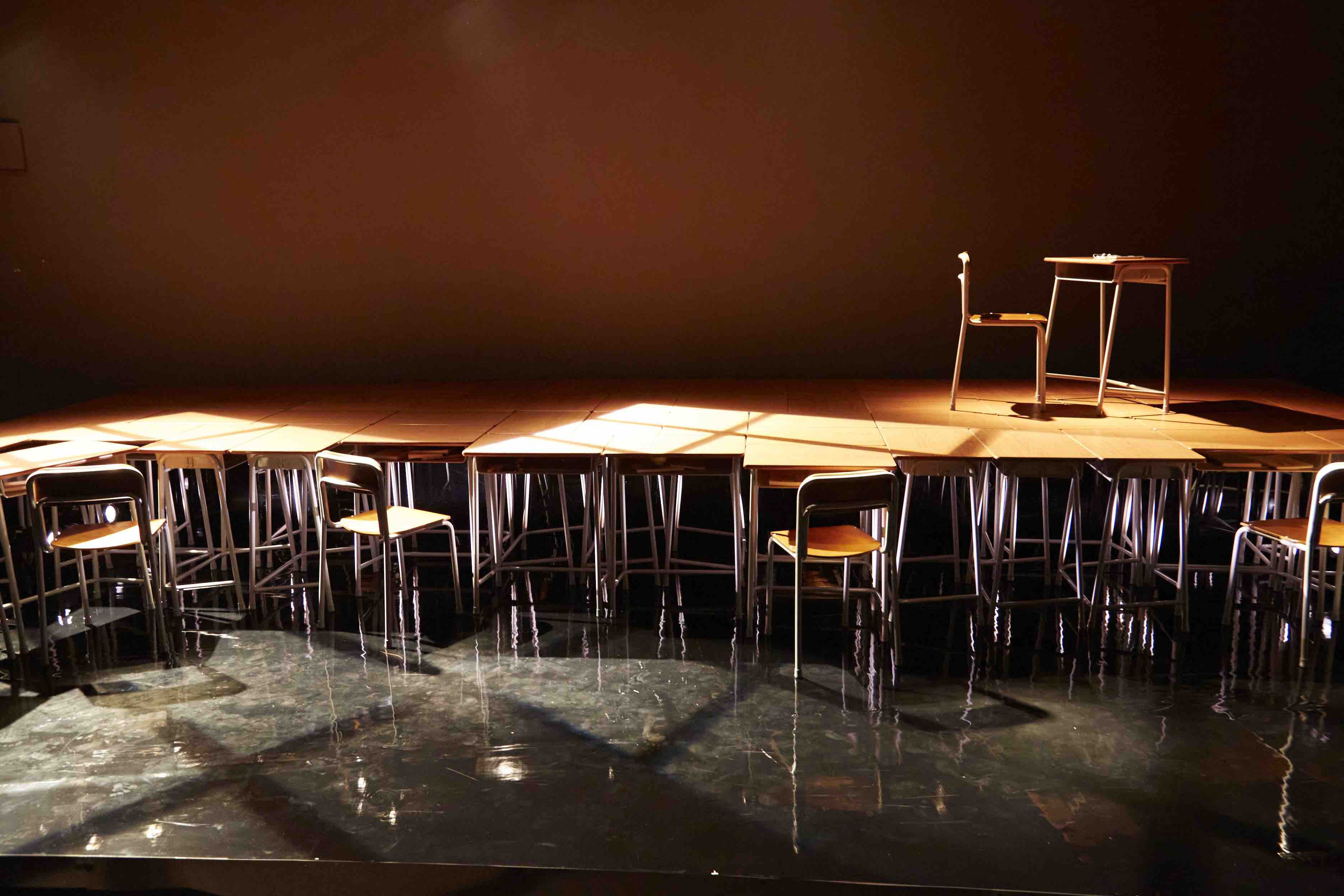 物語の設定は〝学校のプール〟だったので、高校演劇で上演された初演と同じく具象的なプールを作ろうとも考えた。けれど、具象のプールを舞台美術にしようとするとお金がかかりすぎるので、違うプランを考え始める。と同時に、舞台監督から「本当にプールが必要か」という意見アイデアをもらい、この物語に具象的なプールは必要ないのかもしれないと思い始める。物語上どうしても必要だと感じたのが〝高低差〟。登場人物である高校生たちが普段も使用している学校机を土台にすれば面白いかもと模型を作り始める。広い面の土台は安全面を考え全て固定。数個だけは動かせる状態にし、人物たちが好きな場所に置き、その行動によってその場所がプールにもなるという演出。だったのだが、やはり固定をしないと危ないので、動かさないプランに変更。床面はビニールマットの裏側を使用(片面はマットになっていて、もう片面は光沢になっている。多くの舞台で使用されるのはマット側)。机土台の半分から後ろは実は本物の机ではなく、天板だけを貼り付けたダミー土台。そうすることで安全かつ予算もおさえられる。しかし、この美術は脚がとても印象的だったので、ダミー土台には脚がないから、ダミー土台の側面(見える側)に、「鶴かもしれない2020」でも使用した塩ビ板の黒光沢を貼り付ける。そうすることで前側の本物机の脚が映り込み、ダミーにも脚があるように少しは見える。照明も反射し、とても綺麗だった。