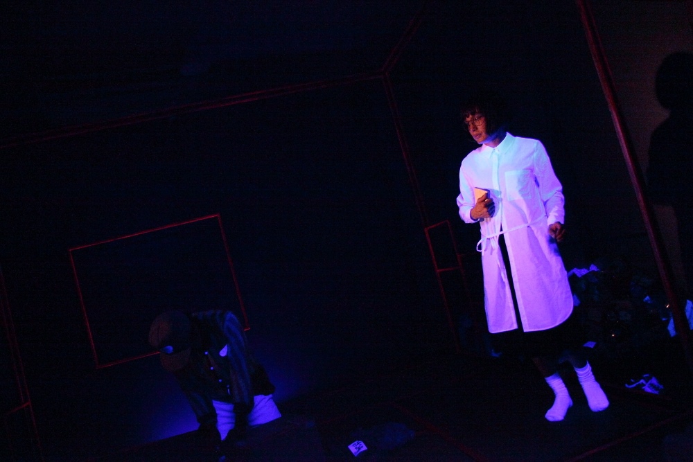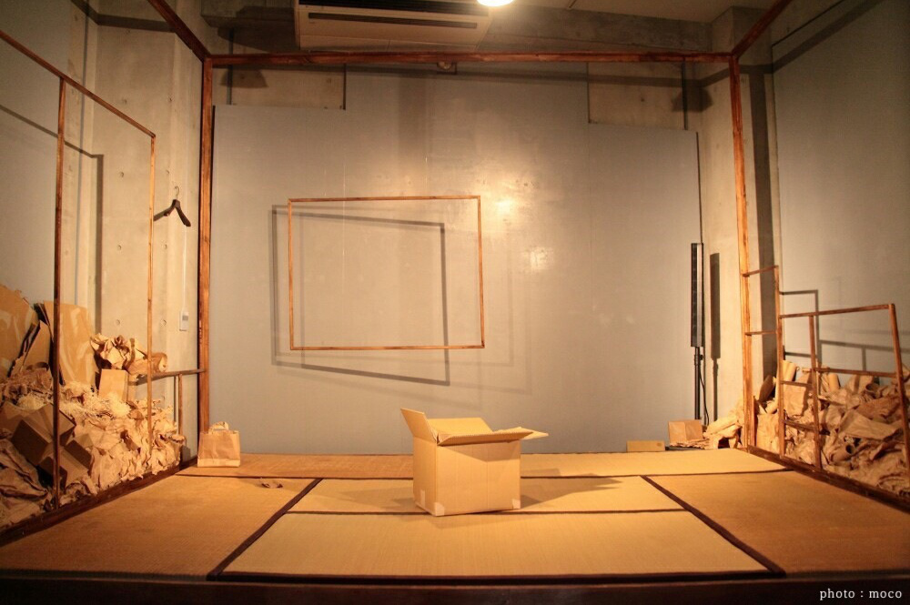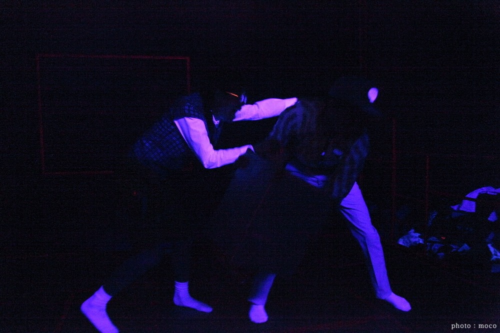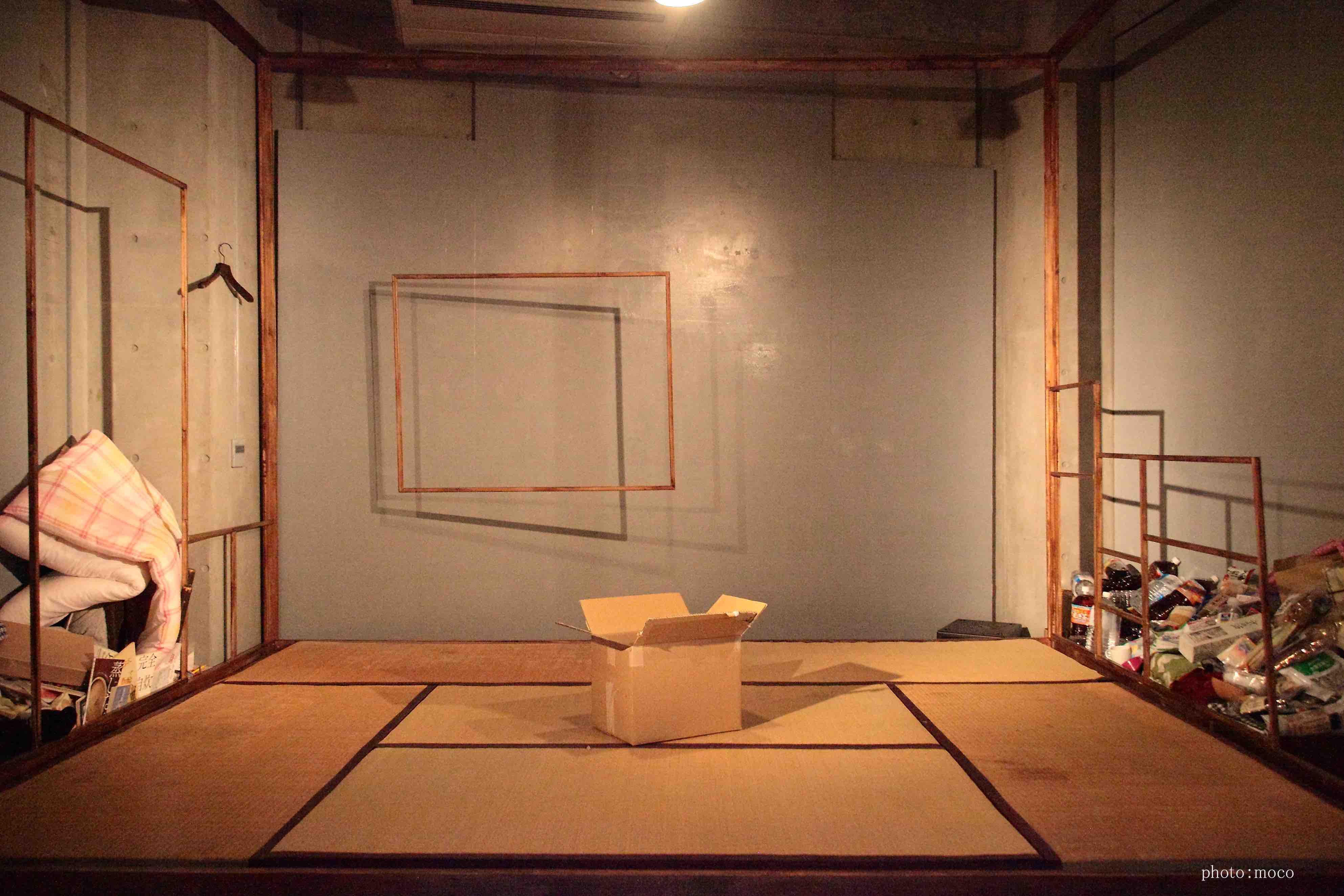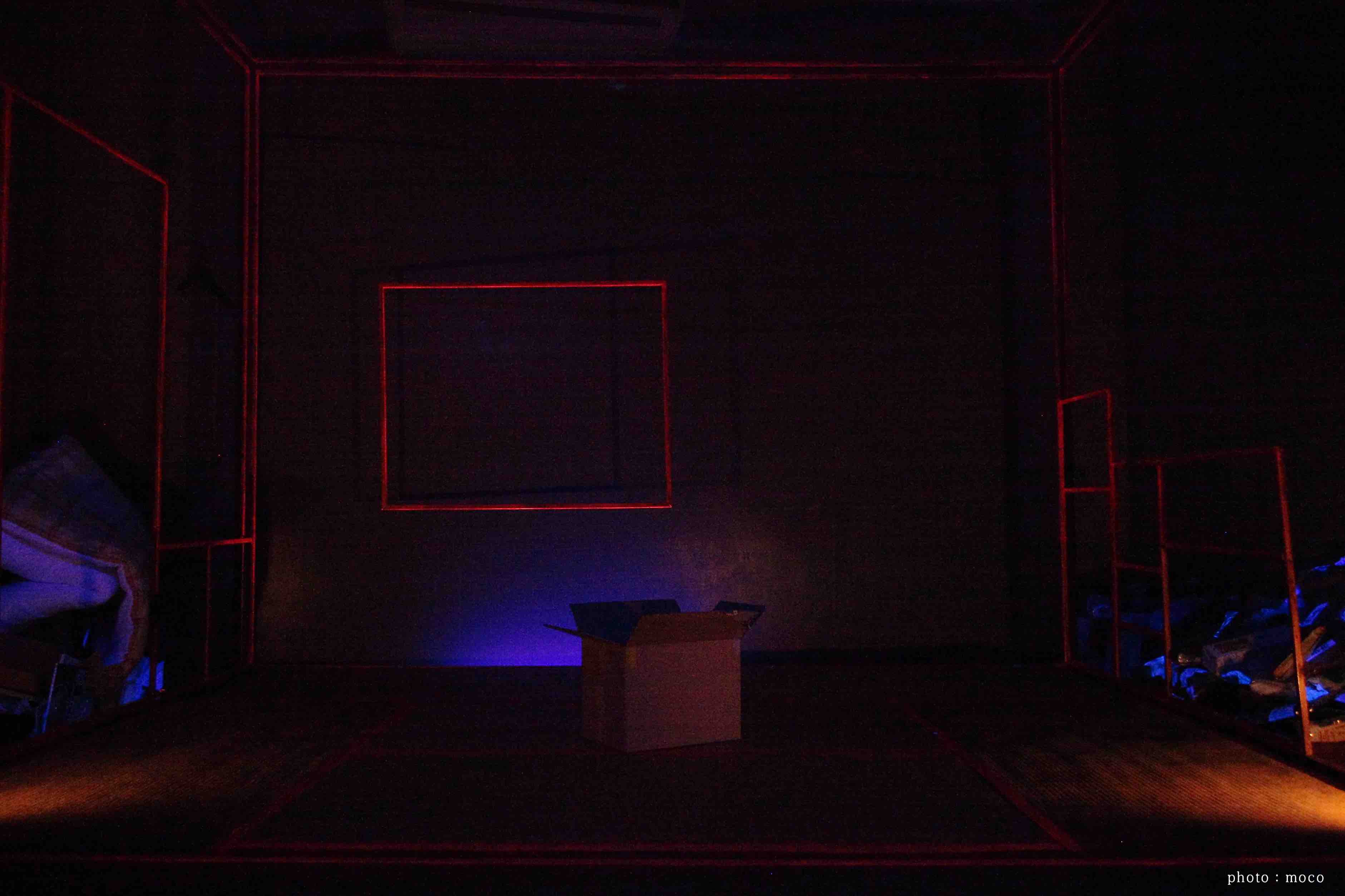 演者を変えての2バージョンあったので、一方は、現実の物を小道具として散りばめ、もう一方は、全てダンボール素材で上演。同じ台本でも演出方法を変えるだけで、こんなにも印象が変わるのかと発見が多かった。特に、ダンボールで上演している方は、集中力や笑い声も増えていたのが興味深かった。おそらく、演者がその場で紙を破いて服にしたり、ダンボール素材の筒をコップにしたりと、これは何だろう?とお客さんが考え理解しながら物語が進んでいくから、物語とは別の楽しみ要素があったからじゃないかと考える。小さなスペースだったので、6畳の畳と部屋の枠組みだけだったが、この枠組みにブラックライト効果の仕掛けをしたのが面白かったこと。通常の明かりでは発色しないのに、ブラックライトには反応し、その部分だけが発色する。お値段も高い塗料なので、なかなか手をだせないが、このブラックライト効果にハマり「鶴かもしれない2016」の衣裳アイデアにも繋がる。水(油の設定)をまくシーンがあったので、畳の下にはブルーシートで対策。畳は、いらない畳ありませんか?と畳屋さんに片っ端から電話をし譲ってもらったもの。